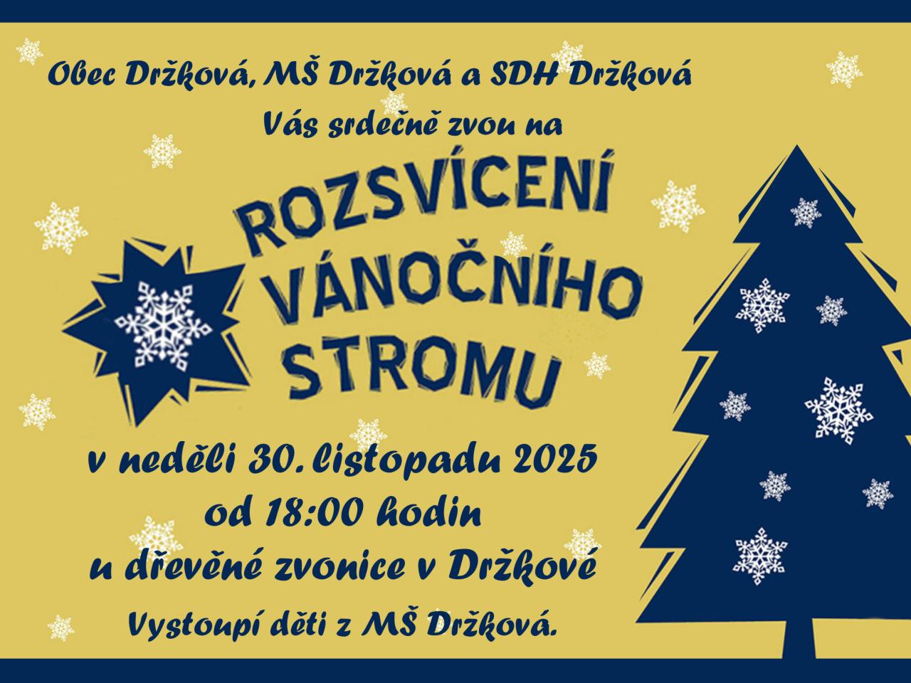 Obec Držková, MŠ Držková a SDH Držková si vás dovolují pozvat na rozsvícení vánočního stromu v Držkové, které se uskuteční v neděli 30. listopadu 2025 od 18:00 hodin u dřevěné zvonice.