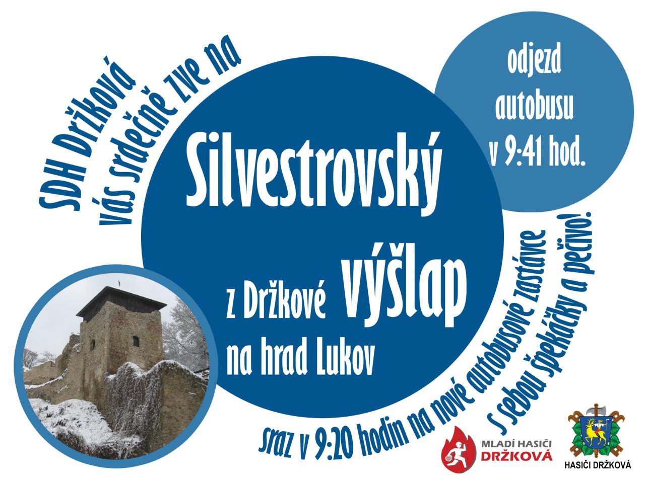 Držkovští hasiči vás srdečně zvou na Silvestrovský výšlap na hrad Lukov. Sraz ve středu 31.12.2025 v 9:20 hodin na nové autobusové zastávce v Držkové. Odjezd autobusu podle jízdního řádu bude v 9:41 hodin od OÚ. Od Rabliny půjdeme po svých.