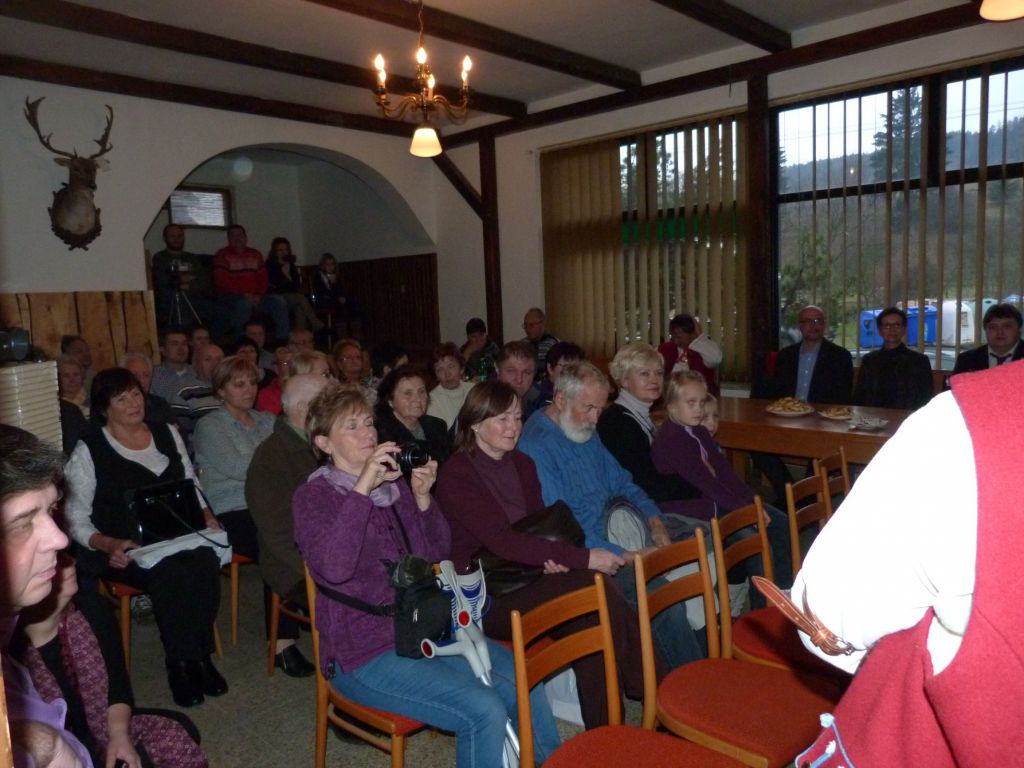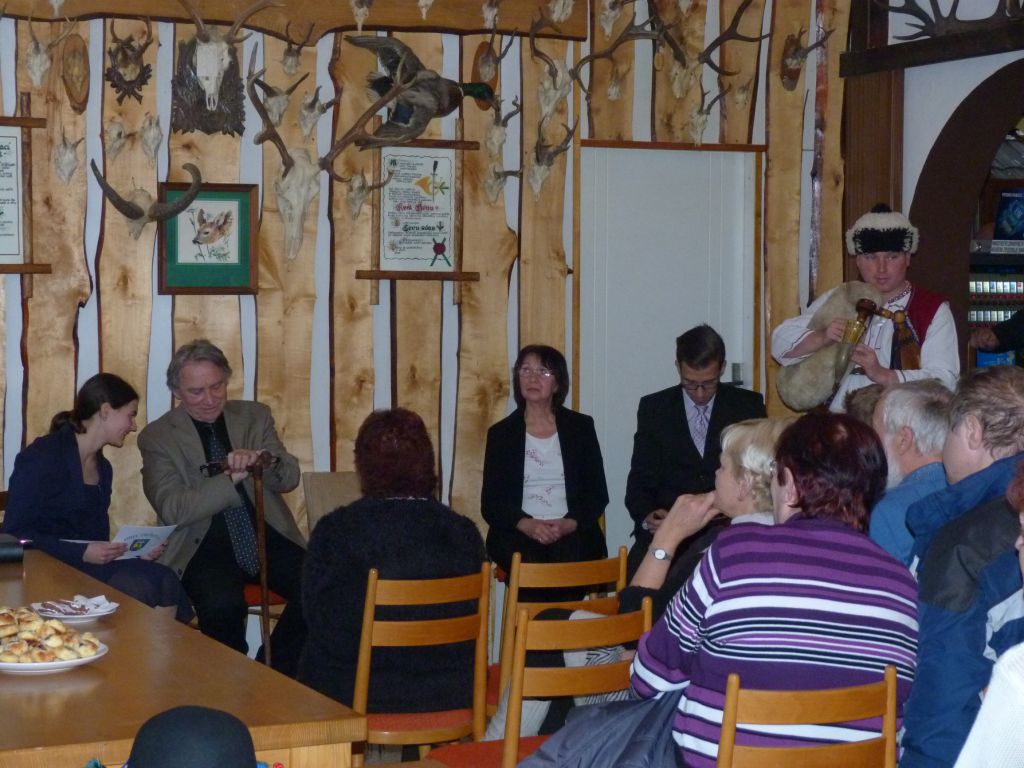 Po slavnostní fanfáře na trombitu valašského gajdoše přišel k moderátorům a hostům dopředu pan starosta. Všichni v sále svévolně povstali, abychom si na knihu společně připili. Po důrazné apelaci pana doktora jsme se dopředu rozhodli knihu nekřtít. Protože podle jeho slov se křtí jenom děcka. Navíc by bylo škoda nejen poničené knihy, ale především rozlité slivovice. Proto jsme raději rozdali všem v sále štamprle, aby si s námi lahodným nápojem z trnek připili. Tímto první část programu skončila.