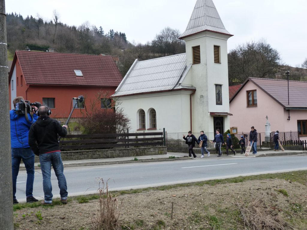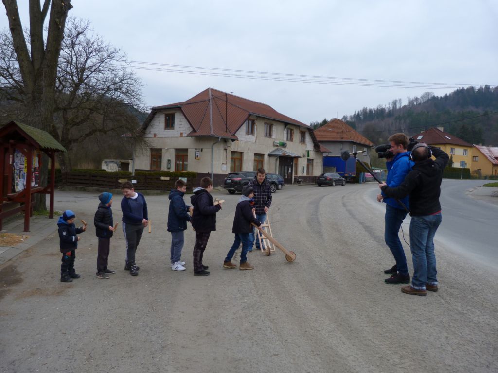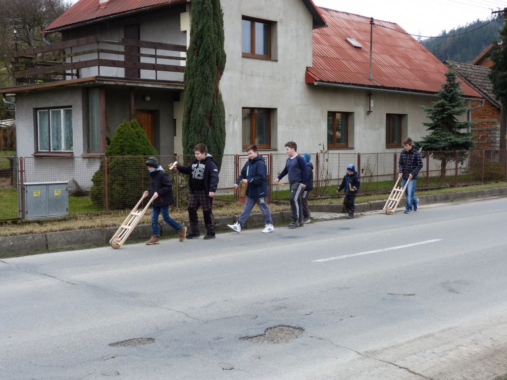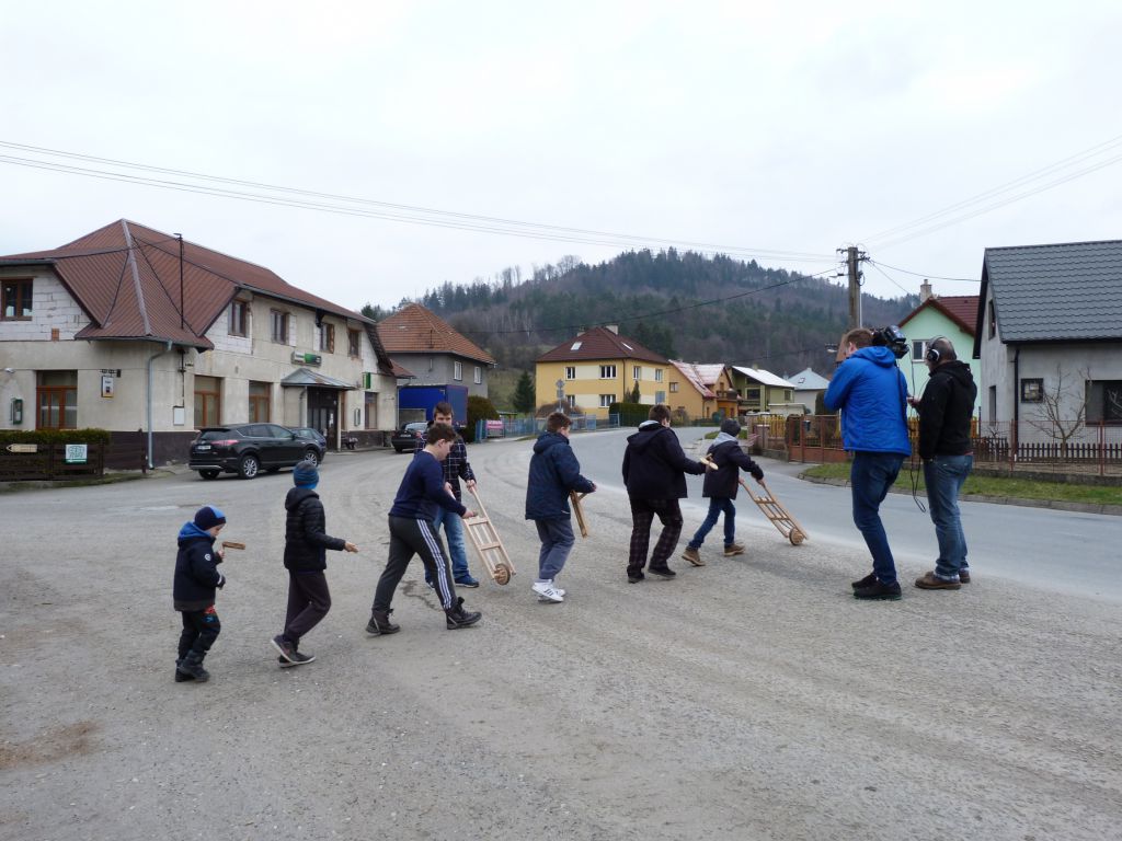 Tradiční obchůzka ogarů s trakaři, klabačkami a řehtačkami nahrazující zvonění zvonů, které odletěly do Říma. Fotografie z Velkého pátku 25. 3. 2016, kdy ogary natáčela Česká televize pro připravovaný dokument o Držkové.