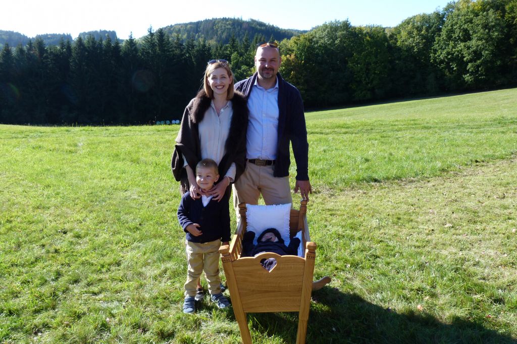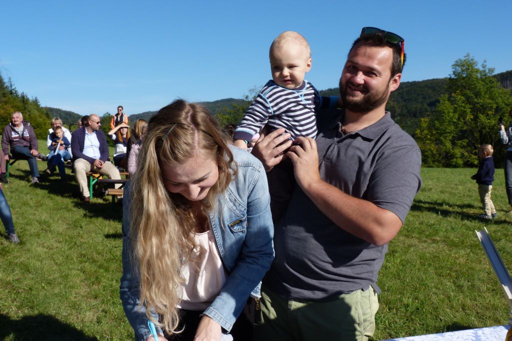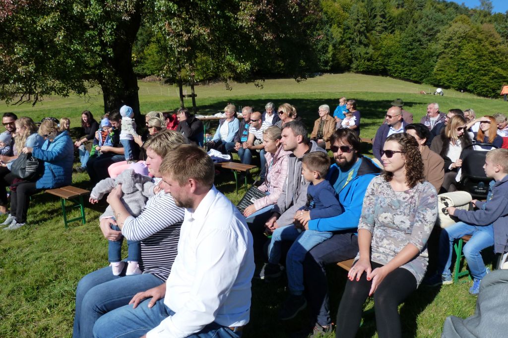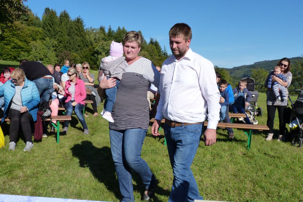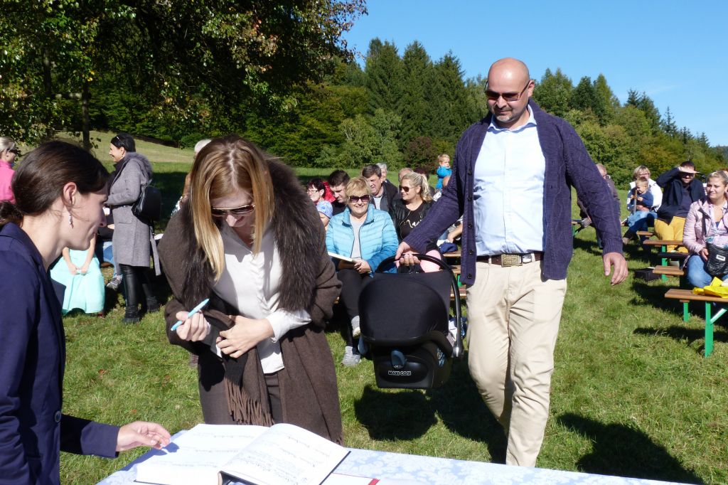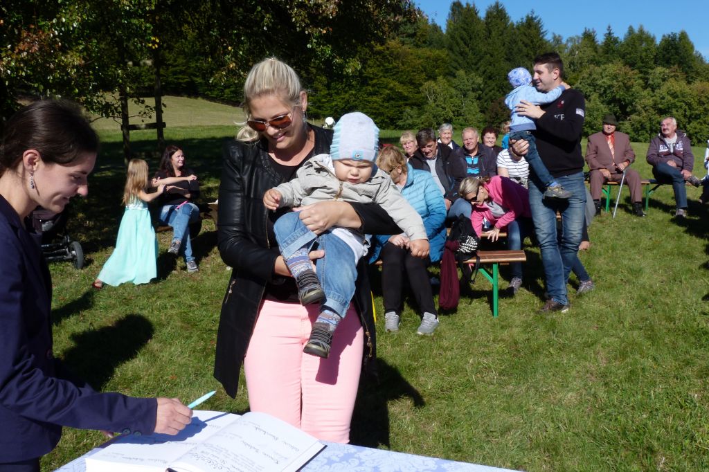 O hodové neděli 30. 9. 2018 proběhlo v Držkové v pořadí již čtvrté vítání občánků. Slavnost se uskutečnila po předchozích úspěších opět v krásné přírodě pod korunou Fojtovy hrušky pod Skalama. Počasí celé akci mimořádně přálo, svítilo sluníčko, listy stromů hrály všemi barvami a sama hruška se již pomalu zbarvovala do svého rudého kabátu. Uvítat se podařilo pět nových občánků, kterým byl v uplynulém roce zastupitelstvem, na základě jejich písemné žádosti, schválen příspěvek na narozené dítě. Slovem slavnost jako obyčejně provázela Petra Marušáková, kulturní program (básnička, písnička a hra na flétnu) si přichystala Emička Roháčková. Po slavnostním proslovu pana starosty se rodiče podepsali do pamětní knihy obce a pro děti obdrželi knihu Valašská dědina Držková s věnováním, sadu dětského nádobí a domovský list obce Držkové. Na konec proběhlo ještě fotografování dětí v obecní vyřezávané kolébce s rodiči a také s ostatními rodinnými příslušníky. Akce v přírodě navíc za krásného počasí se opět setkala s mimořádným úspěchem. Pevně věříme, že nám budou občánci v Držkové i nadále přibývat a že obdobnou akci budeme moci uspořádat i v následujících letech. Ještě jednou přejeme našim nejmenším Držkovjánkům, aby šťastně vykročili do života, který na ně teprve čeká. Nejen jim, ale též rodičům a sourozencům přejeme pevné zdraví, hodně štěstí a spokojenosti.