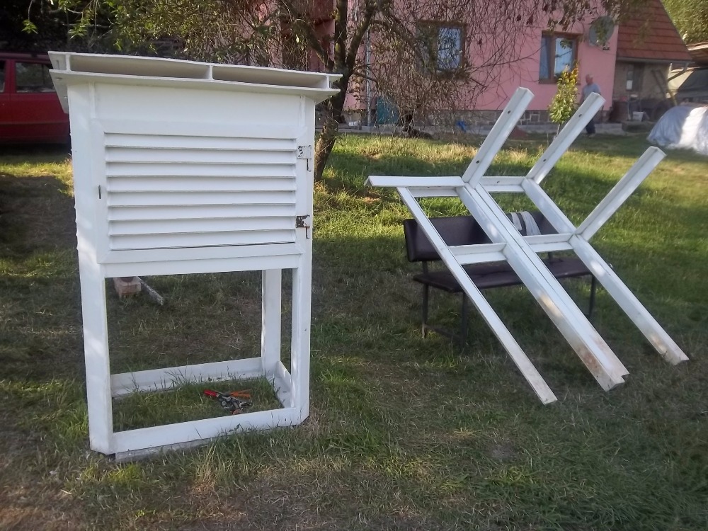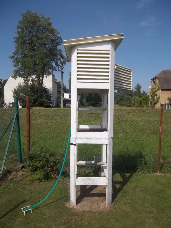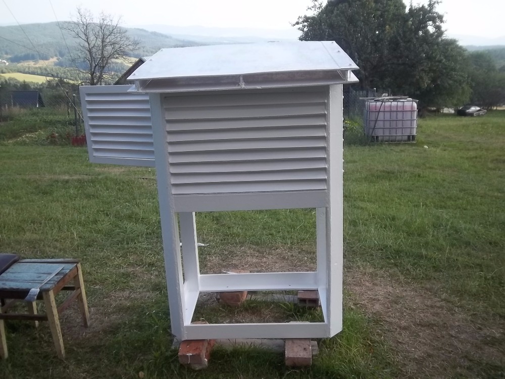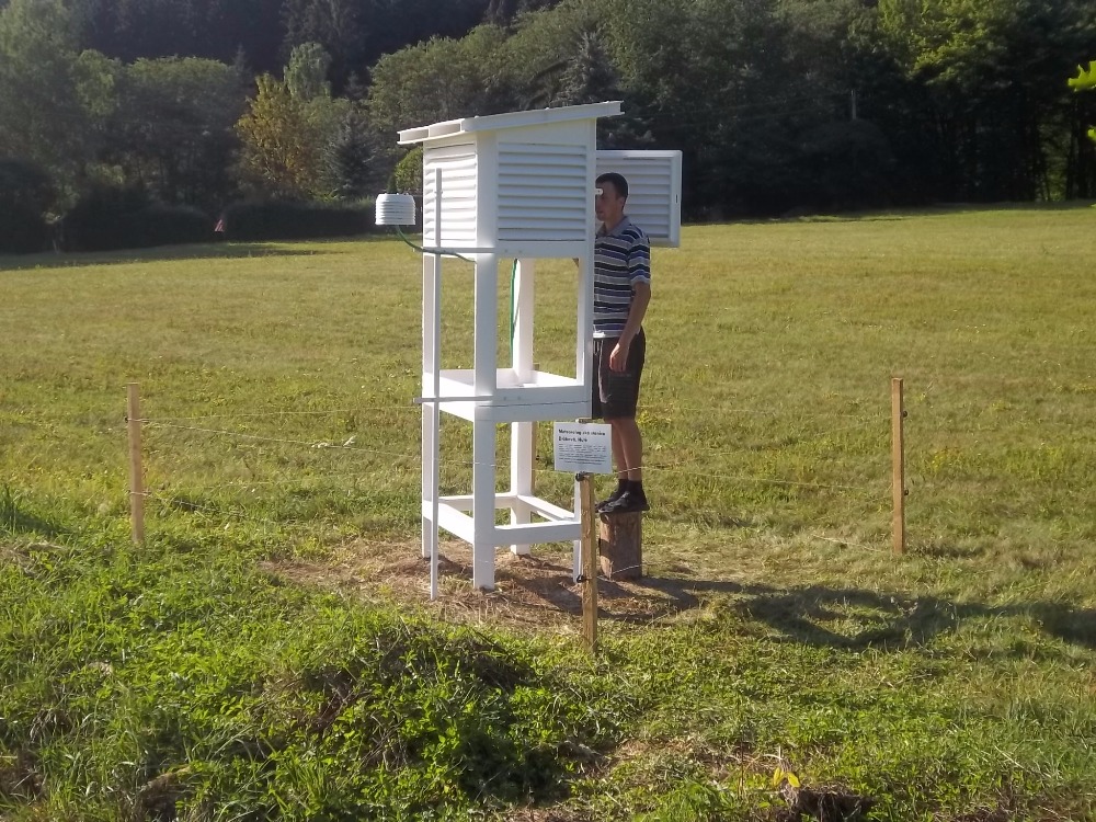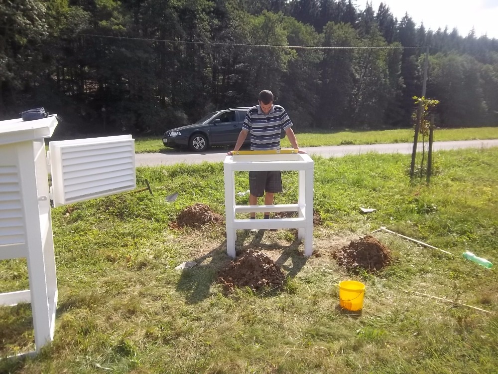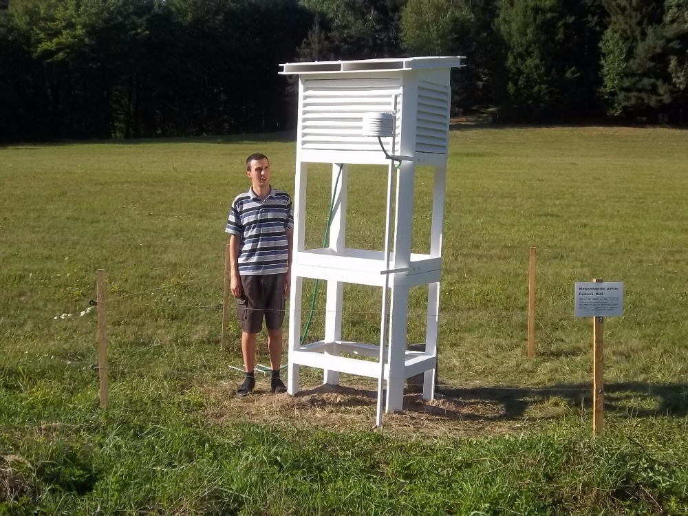 V týdnu od 28. 8. do 3. 9. došlo tedy k instalaci budky, která postupně nahradí současné měření v Hutích. Instalace vyžadovala vyvrtat ručním vrtákem díry do hloubky 80 cm. Již ve 30 cm se vrtání stávalo složitějším a složitějším. Ke slovu se odstalo několik kýblů vody z Dřevnice, které napomohly další vrtání až do 75 cm. Po osazení stojanu byla přišroubována budka, do ní dány přístroje na měření vlhkosti a teploty vzduchu. Na budku byl přimontován i radiační štít pro měření teploty vzduchu ve výšce 2 m nad zemí a taktéž čidlo pro měření přízemní teploty v 5 cm nad zemí. Aktuálně chybí v budce ještě držák na teploměry. Dále bude třeba sehnat schůdky, které jsou nedílnou součástí budky a pro hladké měření a odečet teploty nezbytné. Prosíme tedy, zda by se nenašel šikovný stolař a schůdky nevyrobil. Držák bude snad do 2 měsíců k dispozici a osazen v budce. Zároveň byla budka oplocena ohradníkem proti pohybu zvěři a přidělána cedule s popisem. Budka se nachází přímo u cesty a mnoho lidí bude zvědavých, co že to vlastně na louce stojí. Již při instalaci s kolegou ze stanice z Borkovic u Veselí nad Lužnicí jsme byli pozorováni místním obyvatelem dalekohledem. Poděkování patří především panu Tomáši Dušákovi za poskytnutí budky, jež je stará odhadem 25 – 30 let, dále Lesům ČR za možnost umístit budku a také panu Petru Dočkalovi, který se o místní louku stará a svolil umístit budku do dané lokality. Před instalací budky musela projít nejen samotná, ale i stojan, rekonstrukcí. Stojan byl rozpadlý. Navíc oba tyto díly jsou vyrobeny z polypropylenu, což je plast velice odolný proti povětrnostním vlivům, UV a prakticky se nedá slepit. Jednotlivé části jsou svařovány. Stojan byl na dva kusy a nastal problém s tím, jak jej dát dohromady.