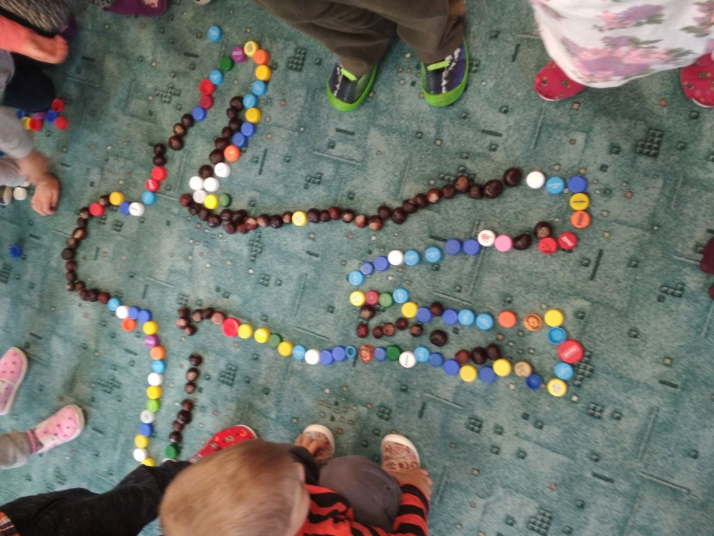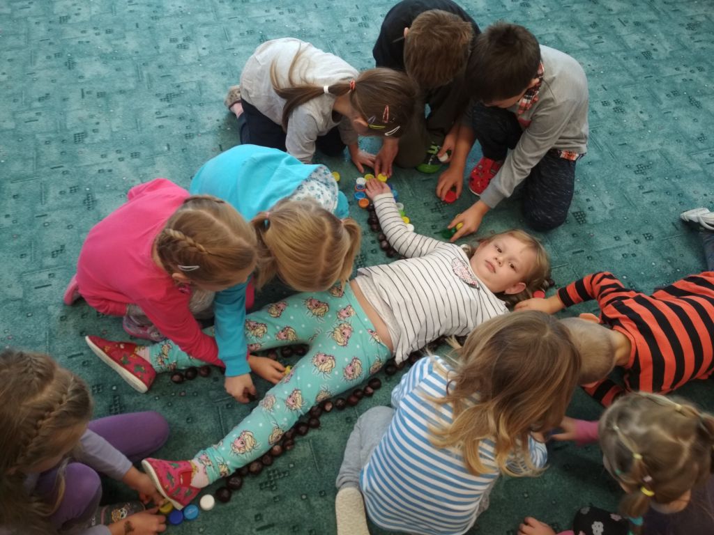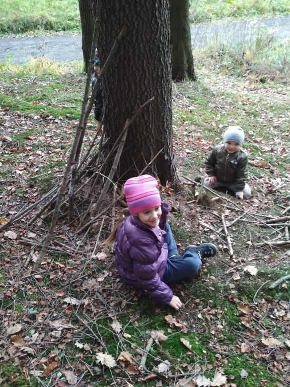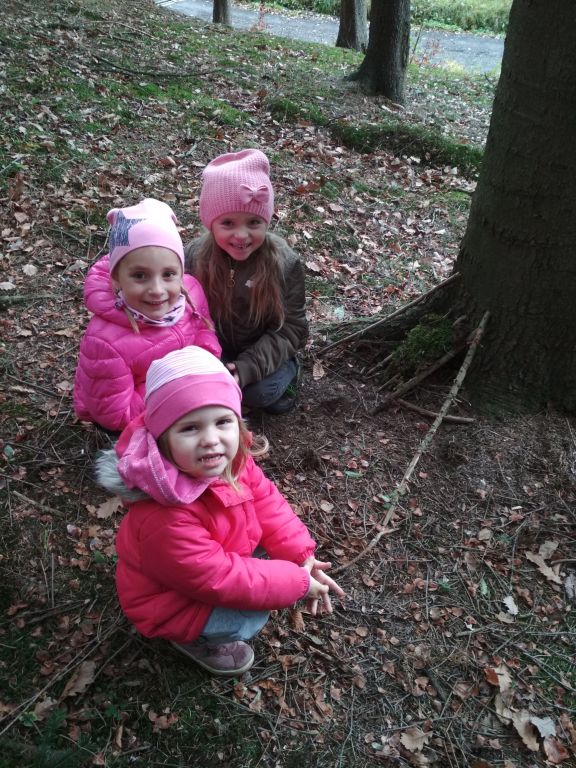 Obskládáváme kamarádku vršky a stavíme domky pro skřítky v lese