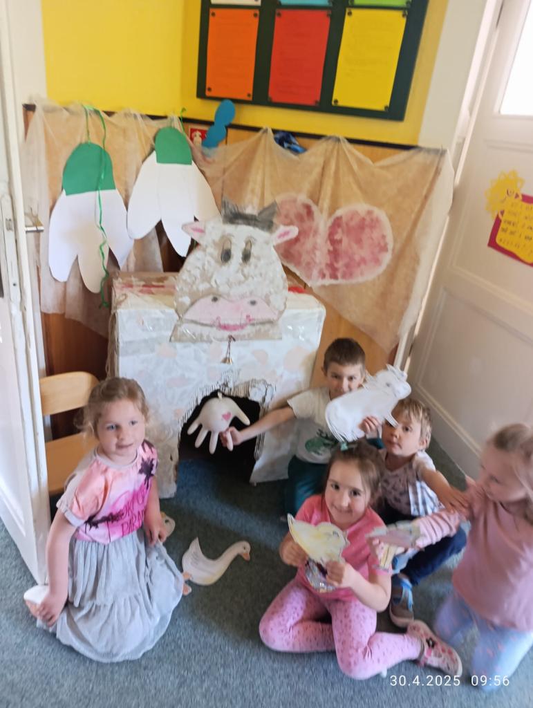 Duben byl opravdu pestrý! Zahájili jsme jej námětovou hrou na školu, při které si děti vyzkoušely, jaké to je být „velkým školákem“. Navštívilo nás divadélko Pohádky z kufru, které vykouzlilo úsměvy na tvářích všech dětí. Vyrazili jsme také na velikonoční výstavu do Vlčkové a ve školce jsme si užili velikonoční dílničky plné tvoření. V neposlední řadě si děti v dubnu mohly zkusit podojit naši kravičku. Měsíc jsme zakončili zábavným a poučným programem Školkadýlko, který děti bavil a zároveň připravil na další velké kroky. Duben byl zkrátka plný tvořivosti, pohybu a jarní atmosféry